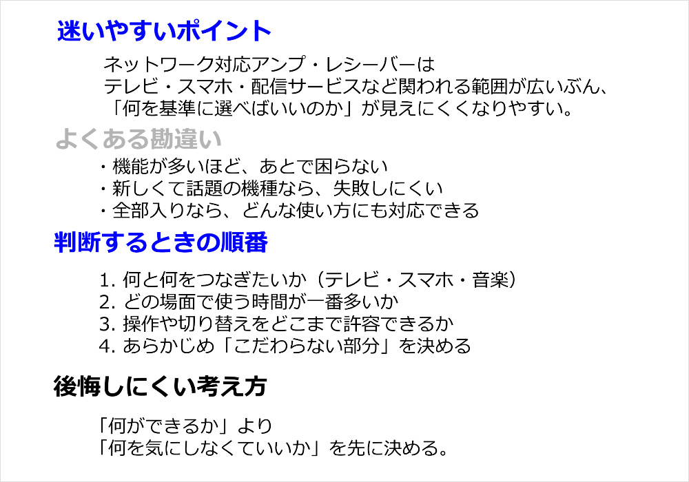 失敗しやすいのは、「評価が高いから」「安くなっているから」といった理由だけで決めることです。ネットワーク対応アンプ・レシーバーは、使い方の前提が合わないと評価が逆転します。