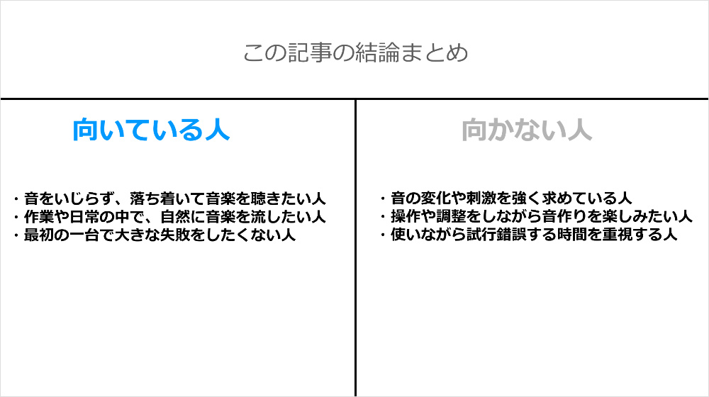 逆に、音の違いを楽しみたい、変化を味わいたい人は、別の方向性を考えた方が満足しやすいでしょう。