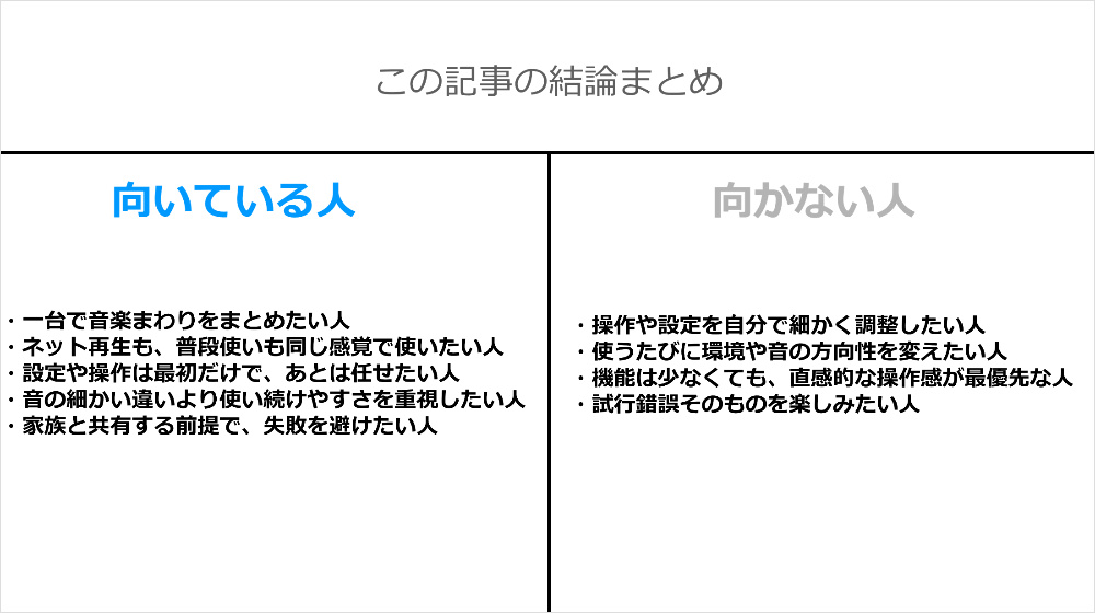 それでも、この機器を選ぶ価値がある人は、毎日の音楽再生をシンプルに、でも幅広くこなしたい人です。ストリーミング中心の再生、AirPlay や Bluetooth を使った流し聴き、レコードやテレビ音声の再生まで、一台で生活音楽を楽に整えたい人には満足度が高いです。逆に、音質調整や自分で細かく設定を追い込みたい人には別の選択肢が向きます。