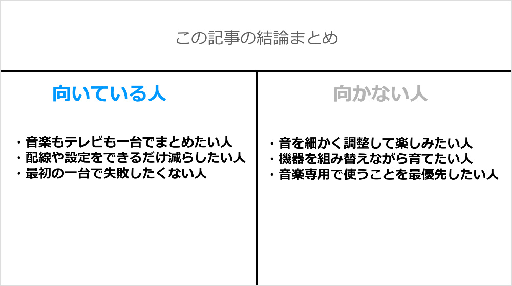 向かない人は、音質を主役にした趣味としてオーディオを楽しみたい人です。拡張や入れ替えを前提に考えると、物足りなさを感じやすくなります。